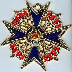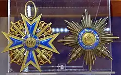 | Popis | zlatý osmihrotý kříž maltézského typu v modrém smaltu se širokým zlatým lemem, mezi rameny kříže jsou korunované iniciály zakladatele, ve středovém medailonu je pruská královská koruna a kolem ní heslo řádu |