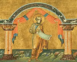 Ruská ikona Zachariáše, jenž drží svitek s počátečními slovy Benedictus (18. století, chrám Záštity Přesvaté Bohorodice, Kiži, Rusko) -