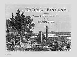 - En resa i Finland (1872–1874, Cesta po Finsku), dílo vyšlo ve dvanácti sešitech, první v únoru 1872 a poslední v zimě 1874. Každá brožurka obsahovala tři ocelorytiny a jednu až pět kapitol, ve kterých Topelius představuje finskou přírodu, lidi a historii s cílem vybudovat národní sebevědomí.[22]