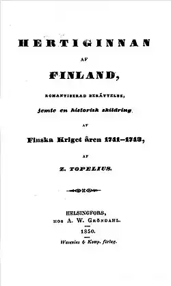 - Hertiginnan af Finland (1850, Vévodkyně z Finska), román odehrávající se během rusko-švédské války v letech 1741–1743, který je nyní považován za první historický román ve finské literární historii.[11]
