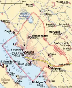 Kromě toho se Italové se italská správa zasazovala o italianizaci enklávy s cílem snížit podíl chorvatského, resp. slovanského obyvatelstva. Přítomná zde také byla i armáda, vojsko tvořilo nemalý počet obyvatel Zadaru.[21] Jednalo se o nejmenší italskou provincii a tvořily ji pouze dvě obce: Zadar a Lastovo. Při posledním oficiálním italském sčítání lidu v roce 1936 měl Zadar 22 844 obyvatel, ostrov Lastovo potom 2 458. Odtržení Zadaru od zbytku regionu znemožnilo další proces dosídlování obyvatel do města, díky čemuž bylo město jediným na východním pobřeží Jaderského moře, jehož počet obyvatel nerostl. Stagnace provázela celé meziválečné období.[22]