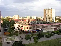 Obchodní centrum Květ v Jabloňové ulici, v pozadí výšková budova Arnika -