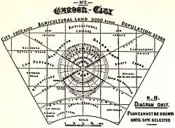 Howardem popisovaný vzor okrouhlého zahradního města, určeného pro asi 30 000 obyvatel, má uprostřed kruhový ústřední park, kolem nějž jsou soustředěny veřejné budovy, obklopené sady. Ze středu vychází 6 radiálních tříd (boulevard), které jsou protínány soustavou soustředných prstencových kruhových tříd (avenue), lemovaných stromořadími. Prostřední z nich, Grand Avenue, je pásem veřejné zeleně, v němž jsou další veřejné budovy. Design rodinných domů není unifikován, dbá se pouze na koncepci a linii ulice. Zástavbu obepíná okružní železnice, kolem níž je soustředěn průmysl. Vně železničního okruhu jsou rekreační území a zemědělské pásmo. Náklady města mají být hrazeny z výběru pozemkového nájemného, zahrnujícího i daňovou rentu, přičemž pozemky mají zůstat ve veřejném vlastnictví. Základním sortimentem má být město zásobováno z vlastních zdrojů. Ve výrobní sféře podporoval volnou soutěž podnikatelů. Zahradní město je navrženo jako uzavřený celek, koncepce nepočítá s plynulým rozrůstáním města. Počítá se s tím, že dceřiná města by vznikla zopakováním téhož schématu v sousední oblasti, tedy jako prstenec měst kolem mateřského města.[1] Z těchto zásad byly při realizaci činěny téměř vždy značné ústupky, protože zahradní města byla vždy navrhována do již urbanizovaného prostoru.