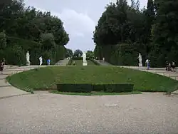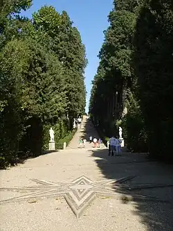 Hlavní osa, se odvíjí od průčelí budovy paláce, vystupuje na vrchol v Boboli, přes zahloubený amfiteátr ve tvaru podkovy.