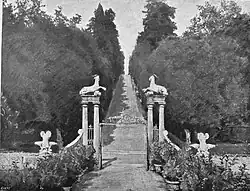 Svažující cesta se cesta mezi L'anfiteatro a plošinou s Fontana del Nettuno