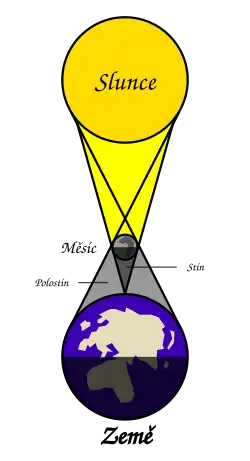 1. Poměry velikostí a vzdáleností neodpovídají skutečnosti, polostín je mnohem užší ve srovnání s průměrem Země.