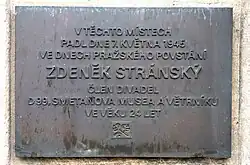 | „ | Z mladičkých herců těchto divadélek připomenu aspoň Antonii Hegerlíkovou,...a zejména Zdeňka Stránského, toho mimořádně nadaného umělce, znamenitého, obětavého organizátora a skvělého člověka, který padl 7. května 1945 v Pražském povstání na balkóně Národního divadla, kde měl právě hlídku. | “ |