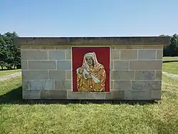 Obraz Panny Marie Lidické uprostřed základů zničeného kostela sv. Martina v Lidicích