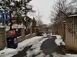 ![]() Střední část ulice Zdobnické, u ulice Želivská (na fotografii za červeným plotem) se lomí vpravo. | |||