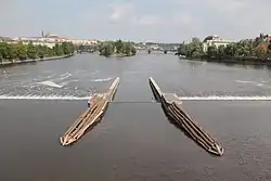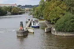 Plavební komora Mánes pro plavbu do prostoru mezi oběma jezy se nachází při pravé straně Šítkovského jezu, při levé straně začátku Slovanského ostrova.