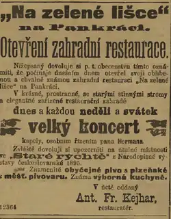| „ | ...nade dveřmi u vchodu starý malovaný obraz na podlouhém, obdélném a ozdobně vykrojeném prkně – zelená liška v postavení, jako kdyby se plížila za nějakou svůdně kynoucí kořistí. Obraz patrně velmi starý... Tento štít visel kdysi venku nad vraty, když „zelená liška“ byla ještě jenom nízký, ale táhlý přízemní domek. | “ |