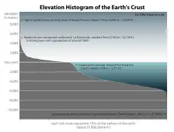 Povrch Země je značně nestejnorodý s velkou výškovou rozdílností. Oceánské oblasti tvořené oceánskou kůrou vytváří obrovské deprese, které vzhledem k nulové nadmořské výšce zasahují několik kilometrů pod její úroveň. Největšího hloubkového extrému dosahuje oceánské dno v oblasti Marianského příkopu v Tichém oceánu, kde dosahuje hodnoty −10 911 m (měření z roku 1995).[18] Kontinentální kůra je oproti tomu většinou nad touto nulovou hodnotou. Suchozemské maximum je dosaženo na vrcholku nejvyšší hory Země Mount Everestu a to 8 849 m (měření z let 2019 a 2020).[19]