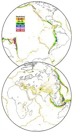 - hluboká – hlouběji než 300 km (nejčastěji do 700 km), 3 % všech zemětřesení[zdroj?]