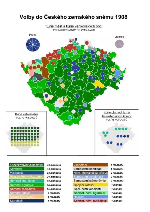 ↑ abKREJČÍ, Dobroslav. Statistika všeobecných voleb do sněmu Království českého, konaných počátkem r. 1908. Praha: Zemská statistická kancelář království Českého, 1908. Dostupné online. S. 38–39.