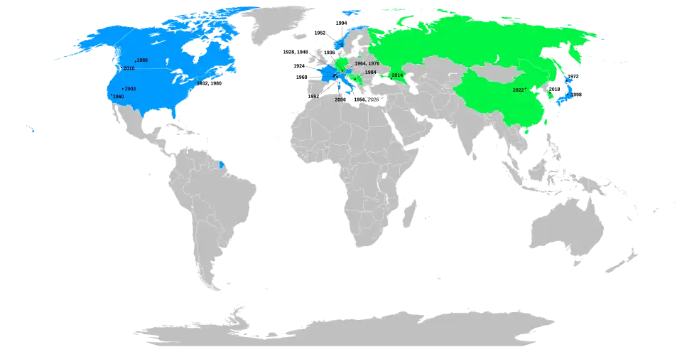 Zimní olympiádu zatím hostilo 13 států: čtyřikrát Spojené státy americké, třikrát Francie, dvakrát Itálie, Japonsko, Kanada, Norsko, Rakousko a Švýcarsko a jednou Čína, Jižní Korea, Jugoslávie, Německo a Rusko.