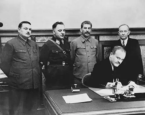 Sovětský svaz podepsal v srpnu 1939 Ribbentrop–Molotovův pakt s nacistickým Německem, který byl v podstatě paktem o neútočení, ale tajný protokol k této smlouvě zabezpečoval hegemonii Moskvy ve východní Evropě a v případě války Německa s Polskem jí dával do rukou Finsko, pobaltské státy, východní Polsko a část Rumunska.[24] Hitler si tím zajistil volné ruce při útoku na Polsko (1. září 1939) a měl otevřené dveře k invazi do západní a severní Evropy. Rudá armáda překročila již 17. září 1939 polské hranice, 28. září 1939 pak Sovětský svaz s nacistickým Německem uzavřel smlouvu o přátelství, spolupráci a vymezení demarkační linie a postupně se chystal k anexi států v Pobaltí a rumunské Besarábie.