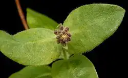 Dorůstá výšky 1–2 m (někdy i 5m )jako liána (na opoře), jako keř 50 cm. Listy jsou protilehlé, celokrajné, široké, oválné, nebo opakvejčité, tmavě zelené, s krátkým řapíkem.