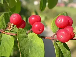 Plod je kulovitá, šťavnatá bobule asi 7 mm velká, která je ve zralosti tmavě červená nebo oranžová. Obsahuje dvě až tři zploštělá, žlutavá semena průměrně 3 mm velká. Plody visí na 2 cm stopkách na větvích keře dlouho do zimy.[1][2][3][5][6][7][8]