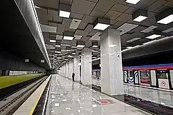 Architekti se v návrhu designu stanice inspirovali estetikou v oblasti typické bytové zástavby 60. let. Nejvýraznější prvkem na stanici je strop. Ten zdobí velké geometrické panely ve třech různých odstínech se závěsnými svítidly. Dynamická kompozice vytváří při pohybu po nástupišti iluzi pohyblivého stropu. Sloupy na nástupišti jsou obloženy světle šedým mramorem, podlaha je obložena stejně barevnou žulou a černým gabro-diabasem. Kolejové stěny se skládají z panelů černé, žluté a tmavě šedé barvy.