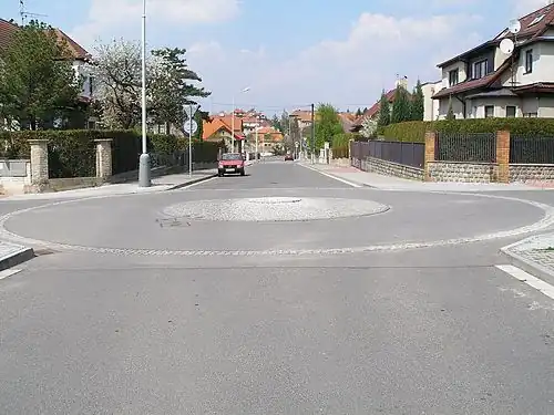 Ke zklidnění dopravy je možné využít též okružní křižovatky (kruhové objezdy), a to buď velké, s nepojížděným středem a jedním nebo více jízdními pruhy, nebo miniokružní, s pojížděným středem. Miniokružní křižovatku doporučují české technické podmínky TP 135 zřizovat při vnějším průměru menším než 23 metrů.[2] Střed velkých okružních křižovatek bývá vyplněn zelení, fontánou, artefaktem či tramvajovou smyčkou.