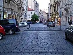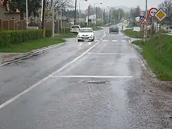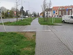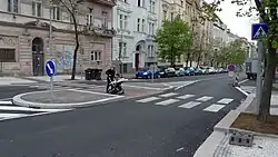 - zúžením vozovek pomocí rozšíření ploch pro pěší zejména v místech přechodů nebo na vjezdu do dopravně zklidněných oblastí (tzv. krtčí uši[1]), ostrůvků, zábran, dopravních šikan (odsazení hran paprsků křižovatky) atd. Tím dojde i ke zpřehlednění provozu a soustředění kolizních míst dopravních směrů na přesná místa.