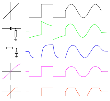 Diagram ukazuje chování signálu (tvořeného obdélníkovou vlnou následovanou sinusová vlna) při ovlivnění různými druhy zkreslení.