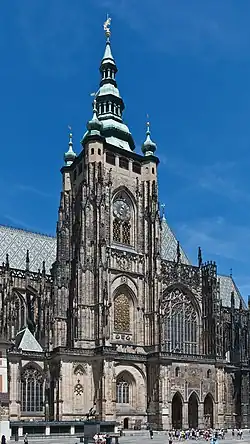 Před jižním portálem katedrály vybíhá do třetího nádvoří Pražského hradu gotický představek se třemi lomenými oblouky, zatímco samotný vchod je tvořený půlkruhovým obloukem na způsob vítězného oblouku s dvojicí šikmo umístěných vrat. Originální řešení předsíně s představeným středovým pilířem a důmyslným řešením žebrové klenby je dílem Petra Parléře. V patře představku, za průčelím ozdobeným mozaikou, se nachází komora korunovačních klenotů přístupná schodištěm z kaple svatého Václava. Běžně nepoužívaný vchod je na vnější straně uzavřen mříží s cyklem broznových reliéfů dvanácti měsíců od Jaroslava Horejce z 50. let 20. století.
