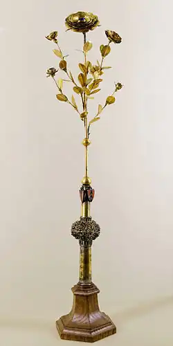 - Basilejská zlatá růže, neboli růže Rudolfa III. z Nideau, vévody z Neuchatelu (1330), je gotická práce, tepaná ze zlaceného stříbra, nodus filigránový, květy s modrými safíry, dva erbovní štítky s červeným a černým emailem, výška se stojánkem 60,5 cm, dárce: papež Jan XXII., autor: Minucchio Jacobi da Siena, Avignon; dlouho byla chována v Basileji, nyní vystavena v Musée de Cluny v Paříži