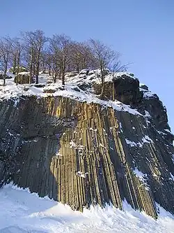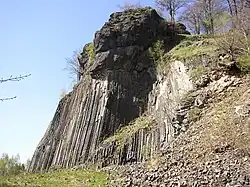 Vrch vznikl erozí původně podpovrchové struktury[4] vypreparovaný ze svrchnokřídových pískovců březenského souvrství (Coniac).[5] Lom odkrývá dokonale vyvinutou sloupcovitou odlučnost v tělese olivinického alkalického bazaltu s mimořádnou délkou sloupů.[5] Masiv se skládá ze tří částí. Vrchní ve tvaru „čepice“ je tvořena sklovitým olivinickým čedičem, její nepravidelné sloupce svědčí o tom, že k tuhnutí došlo rychleji. Podložní část je tvořena dlouhými sloupci olivinického čediče, které mohly vzniknout pouze v prostředí s pomalým ochlazováním magmatu a s tepelnými gradienty nijak nerušenými okolními vlivy. Podložní část (v severní části lomu) je tvořená nefelinickým bazanitem.[5]