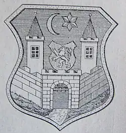 Znak je tvořen modrým štítem se stříbrnou, dvakrát zalomenou hradbou s cimbuřím, na jejíž každé zalomené, šikmé části stojí věž s cimbuřím a červenou jehlancovou střechou a v jejímž středu je otevřená brána s vytaženou zlatou mříží. Mezi věžemi je červený štít se zlatou šesticípou hvězdou a zlatým dorůstajícím půlměsícem.