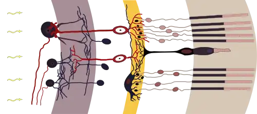Rodopsin je transmembránový protein složený z proteinové složky opsinu a karotenové složky retinalu. Retinal je schopný cis-trans izomerie. Cis konfigurace retinalu je pevně vázána na lysinový zbytek opsinového proteinu a představuje klidový stav. Retinal je však schopen prudce reagovat na dopadající fotony světla. Když totiž dojde k absorpci světla cis-retinalem, změní se na all-trans izomer a uvolní se do cytoplazmy. Změnou konformace rodopsinu se aktivuje G protein transducin. Ten aktivuje cGMP fosfodiesterázu, která rozkládá cGMP na otevřený GMP. Když však v tyčinkách není cGMP, dojde k uzavření sodíkových iontových kanálů, a tak dochází k hyperpolarizaci membrány. To inhibuje synapse na tyčinkových buňkách a vede to k zastavení produkce jistých neurotransmiterů. Jejich nedostatek způsobí depolarizaci membrány nervových buněk v sítnici a vznik akčního potenciálu v očním nervu. Následně dojde k dodání této informace do mozku.[1][2]
