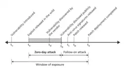 Zranitelnost běžně přetrvává několik let.[3] Využít zranitelnost dokáže speciální program, tzv. Exploit. Exploit má vždy náskok před aktualizacemi, což bývá největší problém. Většinou se exploit vyskytuje ve formě skriptu pro masivní útok (necílený útok, hledání zranitelného počítače a následná snaha o elevaci).