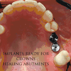 Po zavedení implantátu se vnitřní komponenty zakryjí buď hojivým abutmentem, nebo krycím šroubem. Hojivý abutment prochází sliznicí a okolní sliznice se kolem něj upraví. Krycí šroub je v jedné rovině s povrchem zubního implantátu a je navržen tak, aby byl zcela překryt sliznicí. Po období integrace je nutný druhý chirurgický zákrok, při kterém se sliznice odrazí a umístí se hojivý abutment.[34]:s.190-1