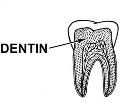 Morfologicky je dentin tvořen odontoblasty a kalcifikovanými fibrilárními kolagenními vlákny matrixu, obklopujícími dentinové kanálky. Nejblíže dřeni leží vrstva nezvápenatělého dentinu, tzv. predentin, která směrem k povrchu jeví postupně známky mineralizace. Někdy zůstává mezi jednotlivými kalcifikovanými okrsky oblast nemineralizovaného, tzv. interglobulárního dentinu. Po ukončení vývoje zubu se během života na původní primární dentin ukládá z pulpální strany nepravidelná vrstva strukturálně podobného sekundárního dentinu, čímž se dřeňová dutina postupně zmenšuje.[1]