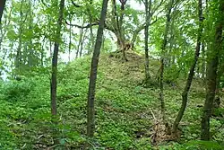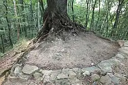 ![]() Zbytky kamenné gotické věže hradu s javorem vyrůstajícím z jejích základů | |