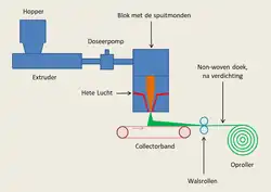 - zařízením k výrobě netkaných textilií na způsob melt-blown nebo spunbond[2]