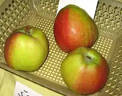 Plod spíše kulatý, nepravidelný, střední (130 - 189 g). Slupka tenká, hladká, základní barva je zelenožlutá, z větší části překrytá červenou barvou.[1] Dužnina bílá, svěže kyselá, nasládlá, jen slabě aromatická.