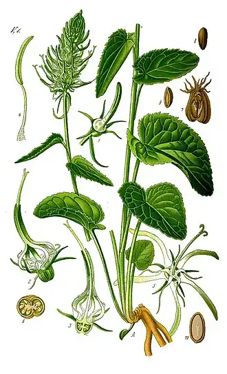 Vytrvalá bylina rostoucí z řepovitého, nepravidelně zhrubnutého kořene s oddenky, která vytváří přízemní listovou růžici a z ní vyráží jedna květná lodyha vysoká asi 20 cm[zdroj?] a 8 mm tlustá. Lodyha je přímá, nevětvená, podélně rýhovaná, dutá a lysá, obvykle přetrvává suchá přes zimu. Listová růžice má listy s dlouhými řapíky, jejich čepele jsou přibližně stejně dlouhé jako široké, (asi 6 cm), na bázi hluboce srdčité, na vrcholu krátce zašpičatělé a po obvodě jednou nebo dvakrát nepravidelně pilovité, ve střední části mívají často tmavou skvrnu. Lodyžní listy jsou podobné přízemním, jen na okraji jsou oddáleně pilovité, směrem vzhůru se čepele stávají delší než širší, řapíky se jim zkracují a horní listy jsou téměř přisedlé a dlouze špičaté.