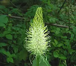 Na vrcholu poměrně nízké lodyhy se vytváří květenství, které bývá za květů dlouhé asi 60 cm a za plodů se prodlužuje i na 80 cm.[zdroj?] Květenství je hustý válcovitý nebo vejčitý klas, sestavený z drobných, krátce stopkatých květů rostoucích z úžlabí úzkých zákrovních listenů, ty jsou celokrajné, na vrcholu ostře špičaté a vzájemně se nepřekrývají. Pětičetné květy mají zelený kalich členěný až k bázi v trojúhelníkovité cípy a bílou, nažloutlou nebo nazelenalou, vzácně i namodralou korunu s dlouhou trubkou, která je nejprve od báze ke špičce spojená a teprve později se vytváří štěrbina uprostřed a v plném rozkvětu se na špici zcela rozevře. V květu je pět, u báze rozšířených tyčinek s čárkovitými prašníky obsahující bledě žlutý pyl. Semeník bývá dvoupouzdrý a nese čnělku s dvouramennou bliznou. Květy jsou protandrické, cizosprašné a bývají opylovány hmyzem.